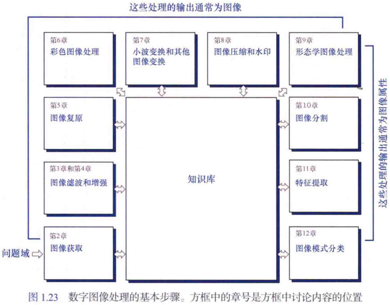本书将数字图像处理界定为输入和输出都是图像的处理,它包含从图像种提取特征的处理,甚至包含各个目标的识别。举例:如文本自动分析。