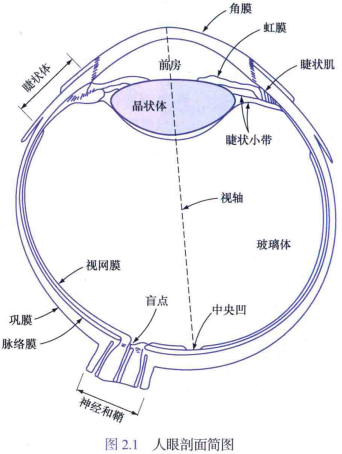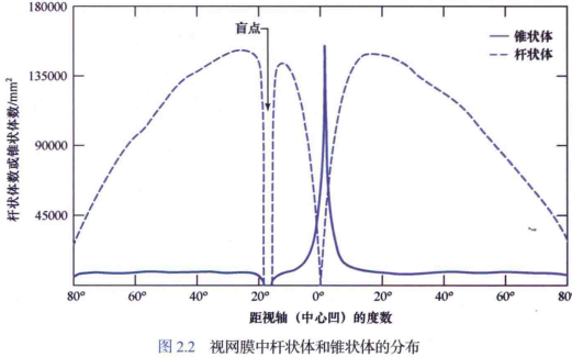 视网膜布满整个后部的内壁。眼睛聚焦时,来自物体的光在视网膜上成像。其上分布有对颜色高度敏感的锥状体和对低光照敏感的杆状体。
